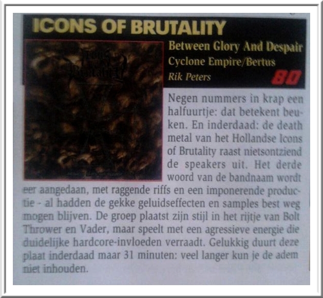 New shows Jeunis leaves IOB New recordings at Dirty Bird Icons of Brutality - Studio Preview 1 Icons of Brutality - Studio Preview 2 New shirts finally arrived New shirts available in February 2014 Waves of Metal Festival was a blast Icons of Brutality - Built to Grind (Waves of Metal 2013) with Rowie on drums And LWD Deathfest was a blast to. Although there were to many open spot in the pit, The last breeze of the summer We wish you a heavy summer Icons of Brutality opens for EXHUMED May 18th, Death Metal in Asgard Video interview for The Core of Brutality Live at Café Sodom This show is scheduled at Friday the 22nd of March 2013. Reviews Signing news “We are very proud to announce that we have signed with German recordlabel Cyclone Empire. Our recordings for our debutalbum were finished in 2012 and after contacting several labels, Cyclone Empire has great bands on their label like Demiurg, Demonical, Onheil etc. We believe this corporation could mean a lot to us and we are very thankfull We hope 2013 will be a great year for us and looking forward to the release of our debut album ‘Between Glory And Despair’ Cheers to all of you and we hope to see you this year.” We also put three masterpieces online. This songs were taken from the Between Glory and Despair-album: Built To Grind ENJOY!